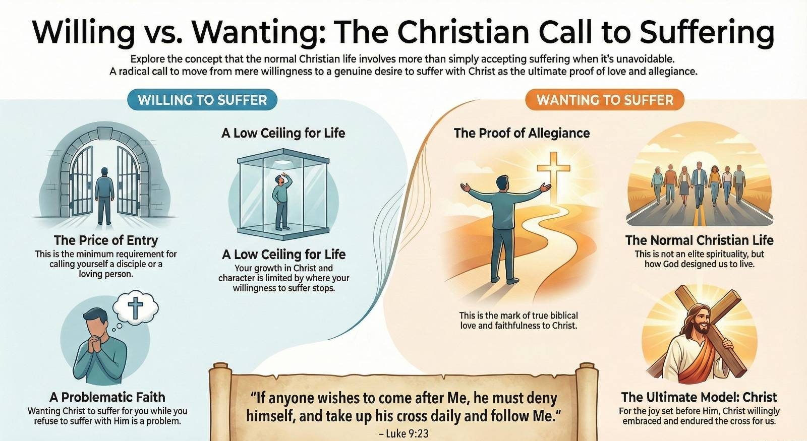 • The “Willing vs Wanting” piece says “true discipleship” requires not just accepting suffering, but wanting to suffer with Christ; “our spiritual ‘ceiling’ is determined by where we refuse to take hits,” and readers are urged to “truly desire to share in Christ’s sufferings.”