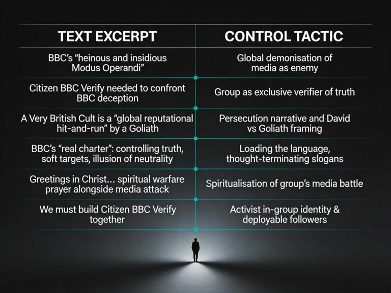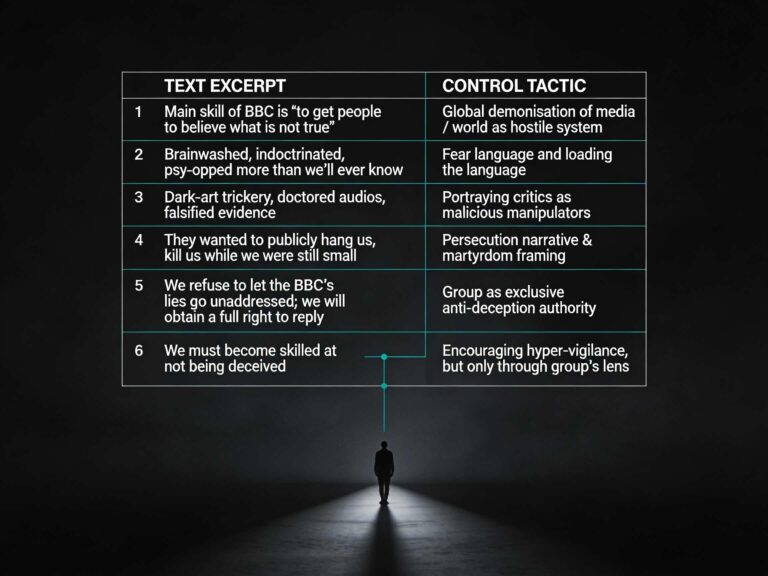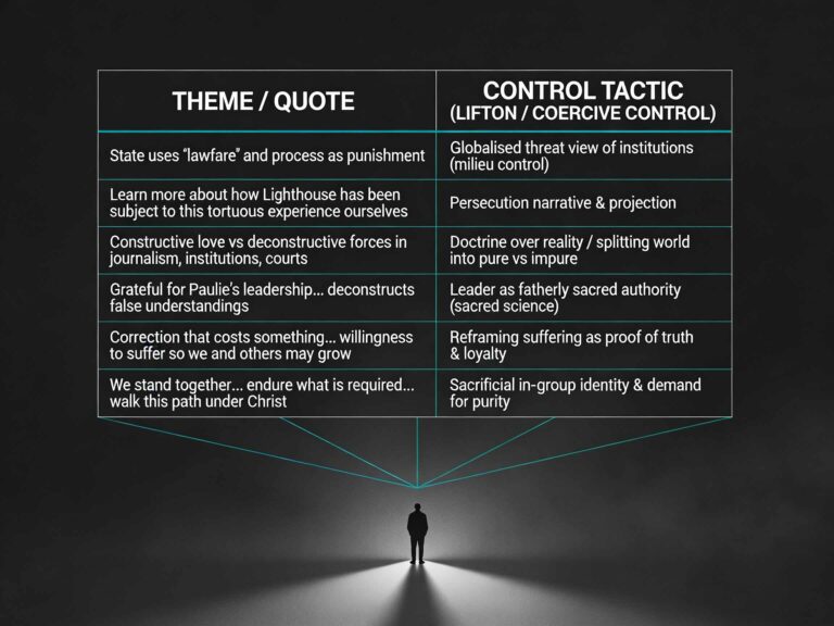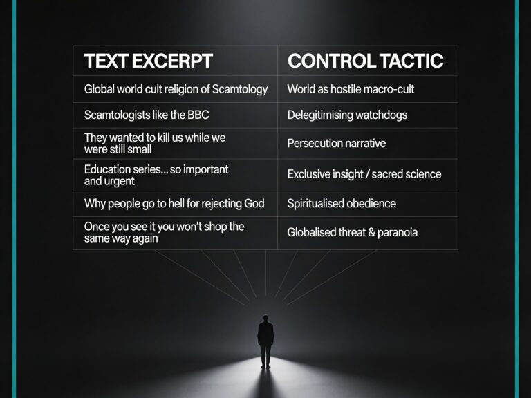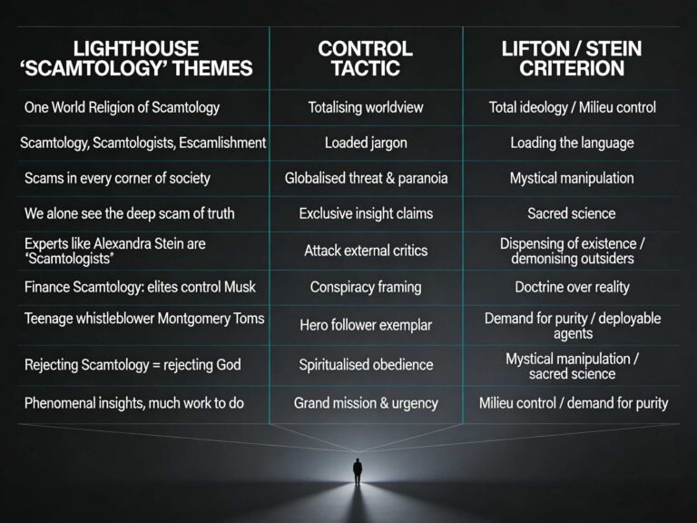 This piece extends the same high‑control pattern: it casts “Scamtology” as a global, totalising religion that only Lighthouse really understands, labels critics and experts as deceptive “Scamtologists,” and strengthens a persecuted, spiritually superior in‑group identity.[1][2][3] 1. World as a single…