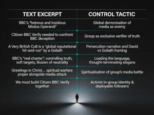 - In reality, the BBC’s “A Very British Cult” investigation was followed by court findings of harassment of the journalist by Lighthouse‑linked individuals. Presenting this as calculated persecution fits the persecution narrative pattern seen across coercive groups: external scrutiny is reframed as malicious attack, reinforcing in‑group cohesion and distrust of critics.[6][7][8][9][10][2][1]