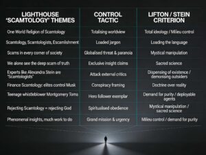 - The truth is reduced to “facts + context,” and it is implied Lighthouse uniquely exposes how Scamtologists twist context, positioning the group as one of the few that truly “sees to it that no one deceives you,” echoing Lifton’s “sacred science” and “total ideology” criteria.[5][6][13]