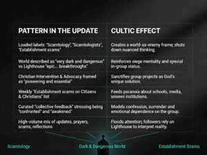 Taken together, this update leverages fear of crisis, distrust of institutions, and a sense of being personally targeted to push followers toward Lighthouse as their only safe advocate and interpreter. The use of loaded language (“Scamtologists”), orchestrated‑crisis paranoia, and “watch this space” promises of exclusive insight are all consistent with documented cultic methods of control and coercion.[6][3][2][1]
