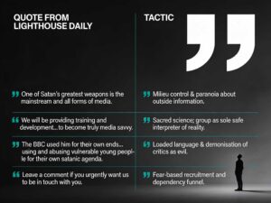 Lighthouse members are kept extremely busy with the manic demands of their Leader. These demands are ever morphing and never completed. The sense of failure on each task crushes their spirits, only to be raised again on a never ending stream of new initiatives.