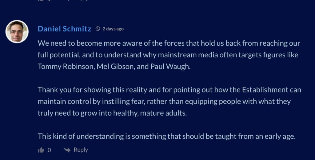 - The text constructs a polarized “us versus them” worldview: Lighthouse and aligned figures (Paul Waugh, Tommy Robinson, Mel Gibson) are God’s embattled servants, while “the Establishment” and “mainstream media” are portrayed as tyrannical, satanic forces controlling society.[2][3]
