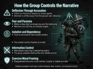 - This fits Langone and Lalich’s description of cults fostering a persecuted remnant identity, where external criticism is proof of special status and justification for further isolation.[5][2]