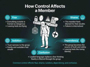 • In cultic terms, that loop is important because it reduces dissent, increases dependency on the group’s interpretation, and makes agreement feel like faithfulness.[2][6][5]