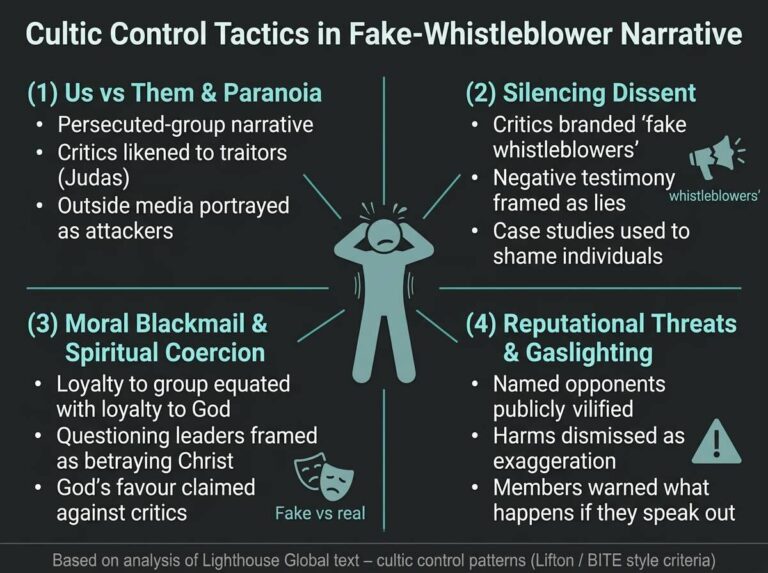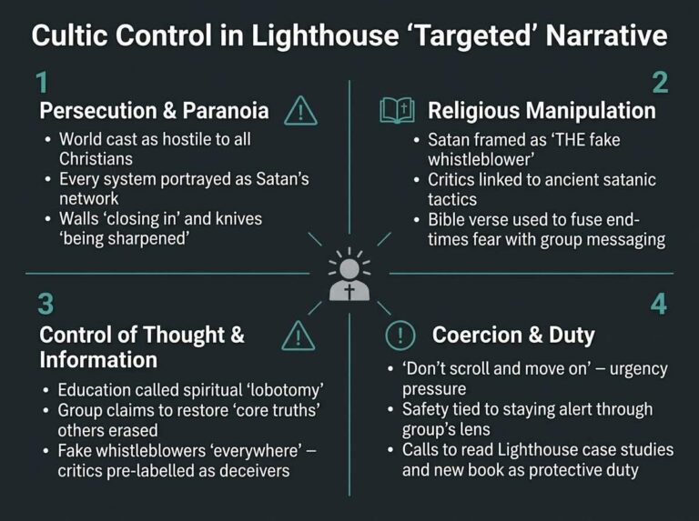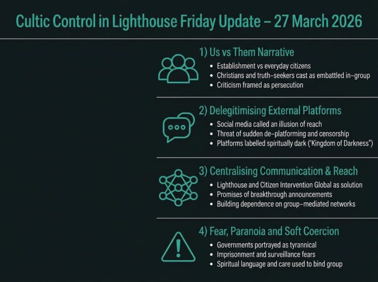 This “Indispensable Christian Love, Unity and Advocacy” update uses several hallmark methods of high‑control religious groups: urgent end‑times fear, an embattled in‑group under attack by a corrupt Establishment, and Lighthouse‑centred “solutions” that fuse spiritual faith with loyalty to the organisation.…