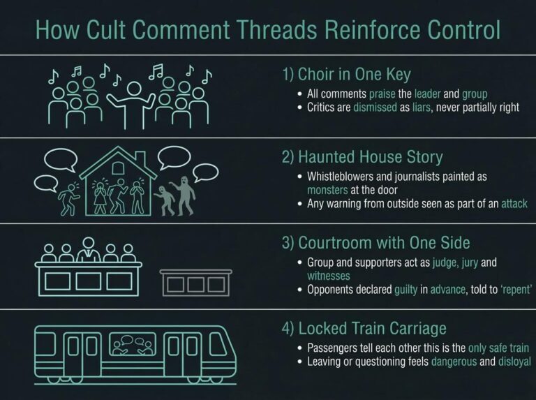 These comments echo and reinforce core high‑control dynamics: absolute loyalty to the leader, demonisation of critics as evil “fake whistleblowers”, and spiritualising the conflict so that siding with Lighthouse equals siding with God and truth. In metaphor terms, the comment…