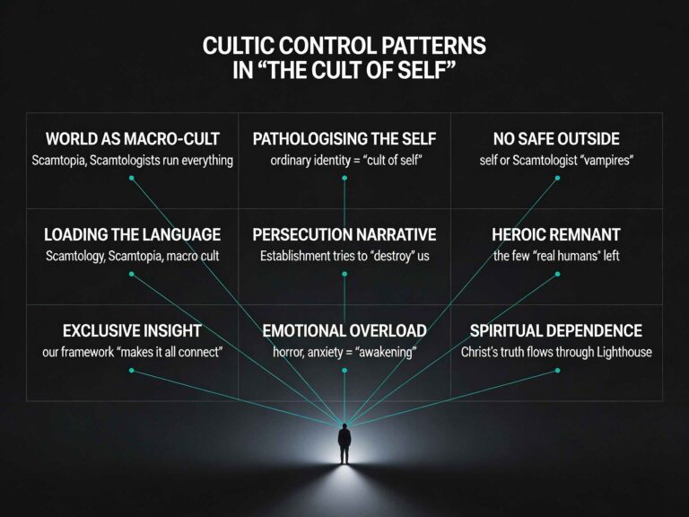 This text again shows a dense pattern of high‑control / cultic techniques: it paints the world as a sinister macro‑cult, pathologises ordinary people as hollow “cult of self” members, and casts Lighthouse as a persecuted, spiritually elite remnant.[1][2][3][4] 1. “Macro‑cult”…